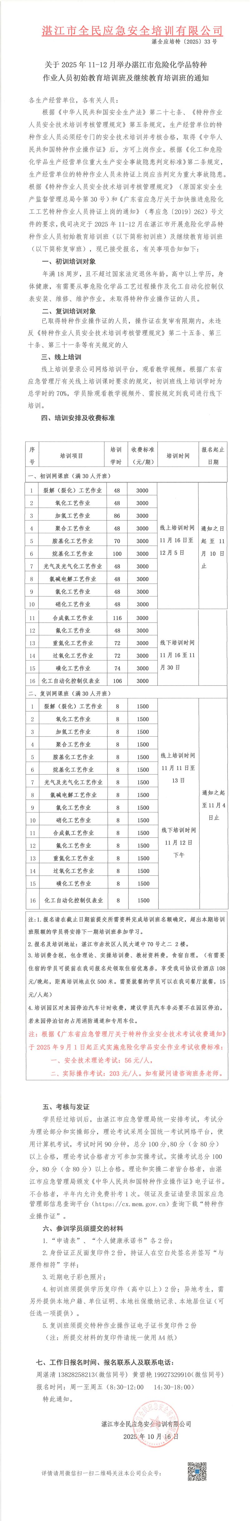 關于舉辦2025年11-12月份湛江市危險化關于舉辦2025年11-12月份湛江市危險化學品特種作業初訓培訓班的通知